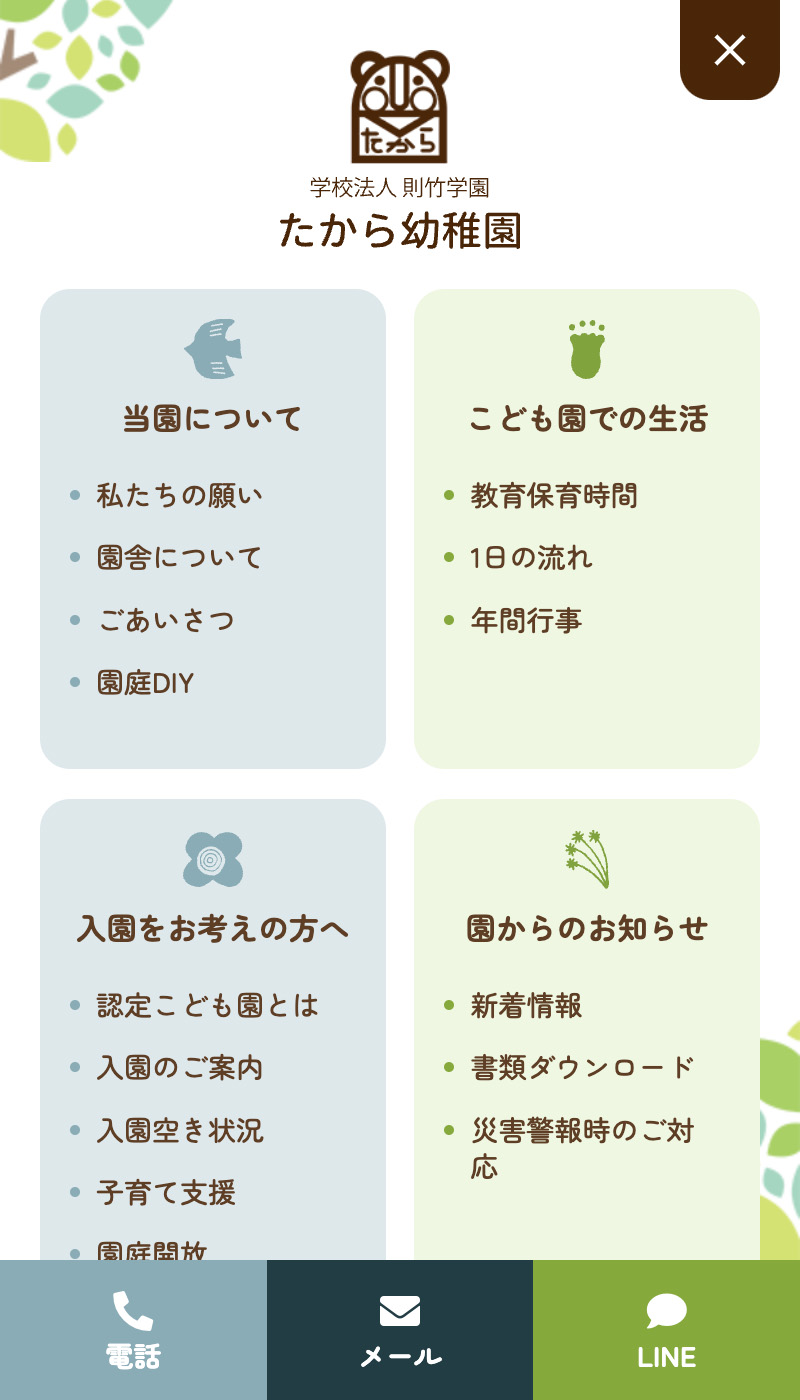 ちぎり絵のような温かみのあるイラストがポイント。各グループ園もわかりやすくまとまっており、ユーザーに親切です。