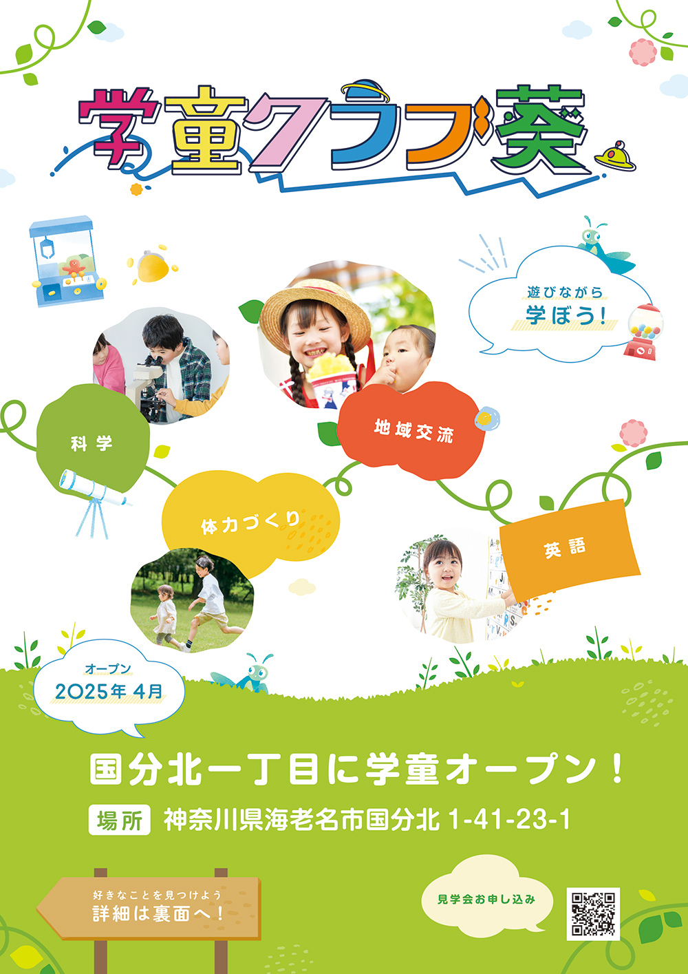 2025年に海老名市にオープンした「学童クラブ葵」様のロゴ、屋外看板、送迎車用のロゴ、チラシ、イラスト制作をお手伝いしました。