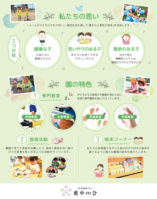 「私たちの思い」や「園の特色」とのコアメッセージを中心に伝えたいことばを記載。背景を淡いグリーンにホームページの雰囲気に沿って水彩風に仕上げました。
