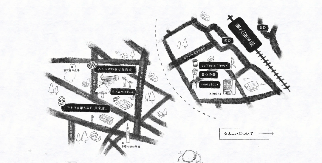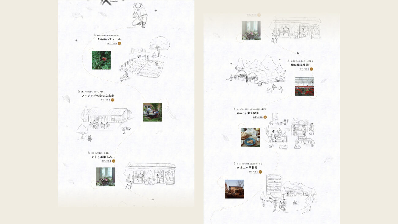 サイト内には、同じ人物がさまざまな場所に登場し、まるでタネニハの中を散歩しているようなイメージにしています。