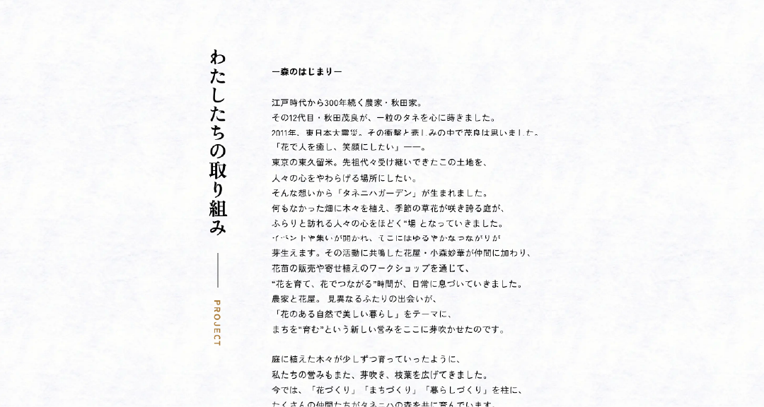 「タネニハについて」のページは文字情報がメインでしたが、まるで小説を読むような気分でタネニハを知っていただけるよう、文字組みにもこだわりました。