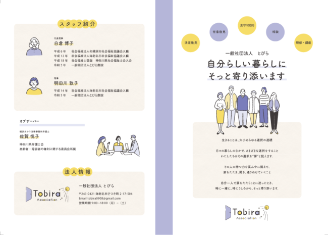 海老名市で成年後見人の業務及びその関連事業を行う「一般社団法人 とびら」様のロゴ・名刺・パンフレット制作をお手伝いいたしました。